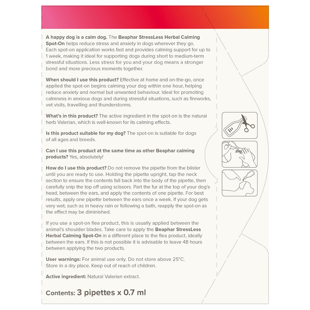 Beaphar Calming Spot On offers a gentle yet effective way to ease stress and unwanted behaviours in dogs. Formulated with natural Valerian extract, known for its soothing properties, each application begins working within an hour and provides up to one week of calm. Perfect for use during stressful events such as fireworks, travel, vet visits, or periods of behavioural difficulty.