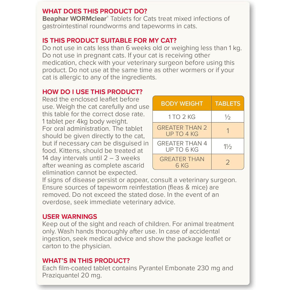 Protect your feline from harmful internal parasites with Beaphar Worm Clear. This fast-acting worming tablet kills both roundworms and tapeworms in cats and kittens from just 6 weeks of age — all in one easy dose.