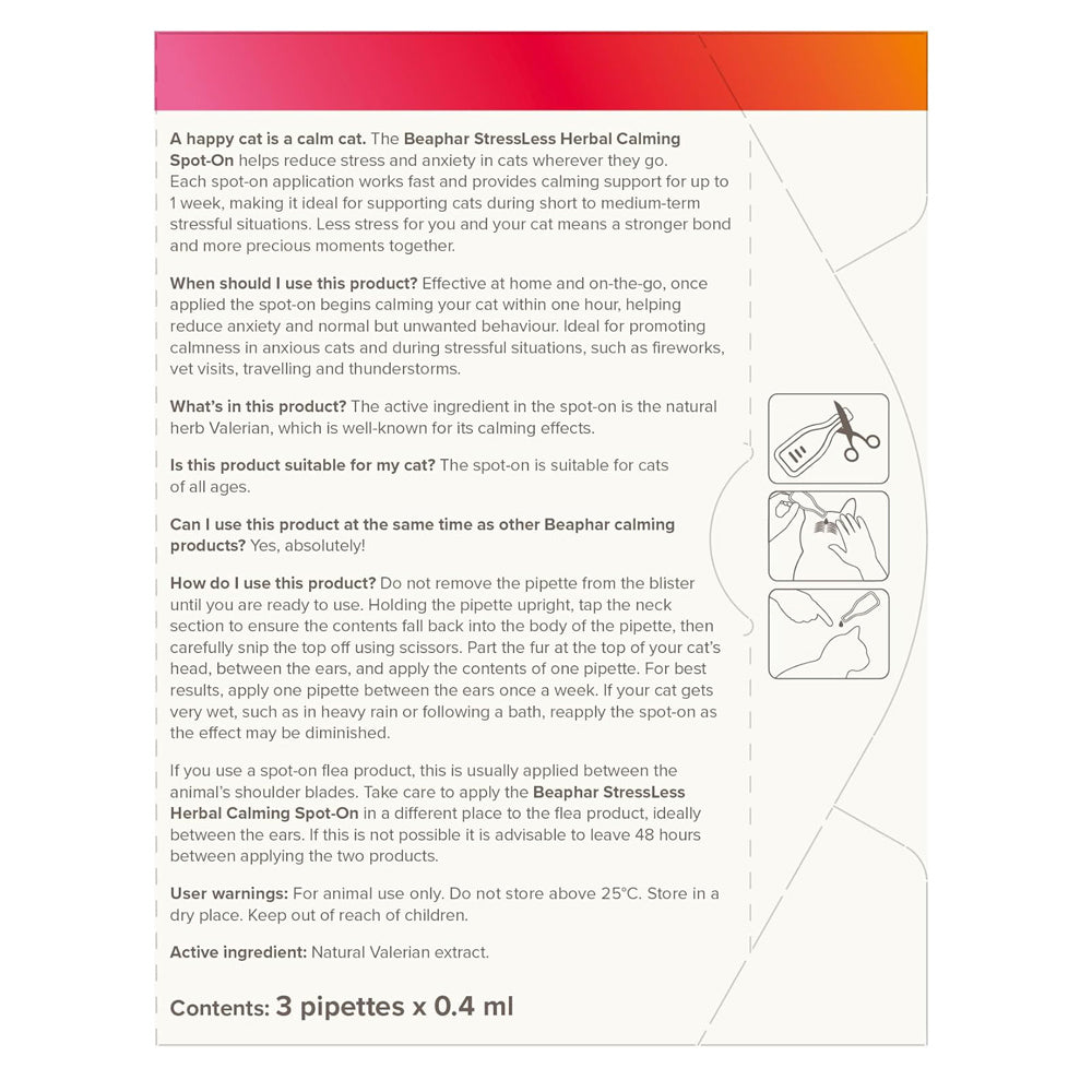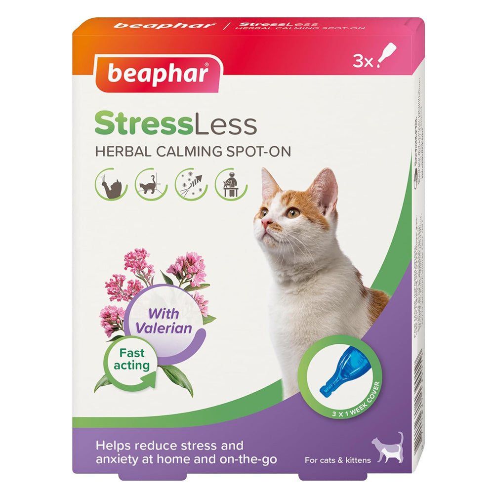 Beaphar Calming Spot On is a fast-acting, herbal remedy designed to help reduce stress-related behaviours in cats. Formulated with Valerian extract, it naturally soothes without sedation. Each easy-to-use pipette provides calming support for up to one week, making it ideal during periods of anxiety such as vet visits, fireworks, or changes in routine.