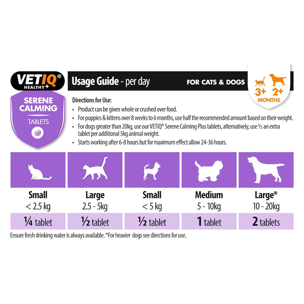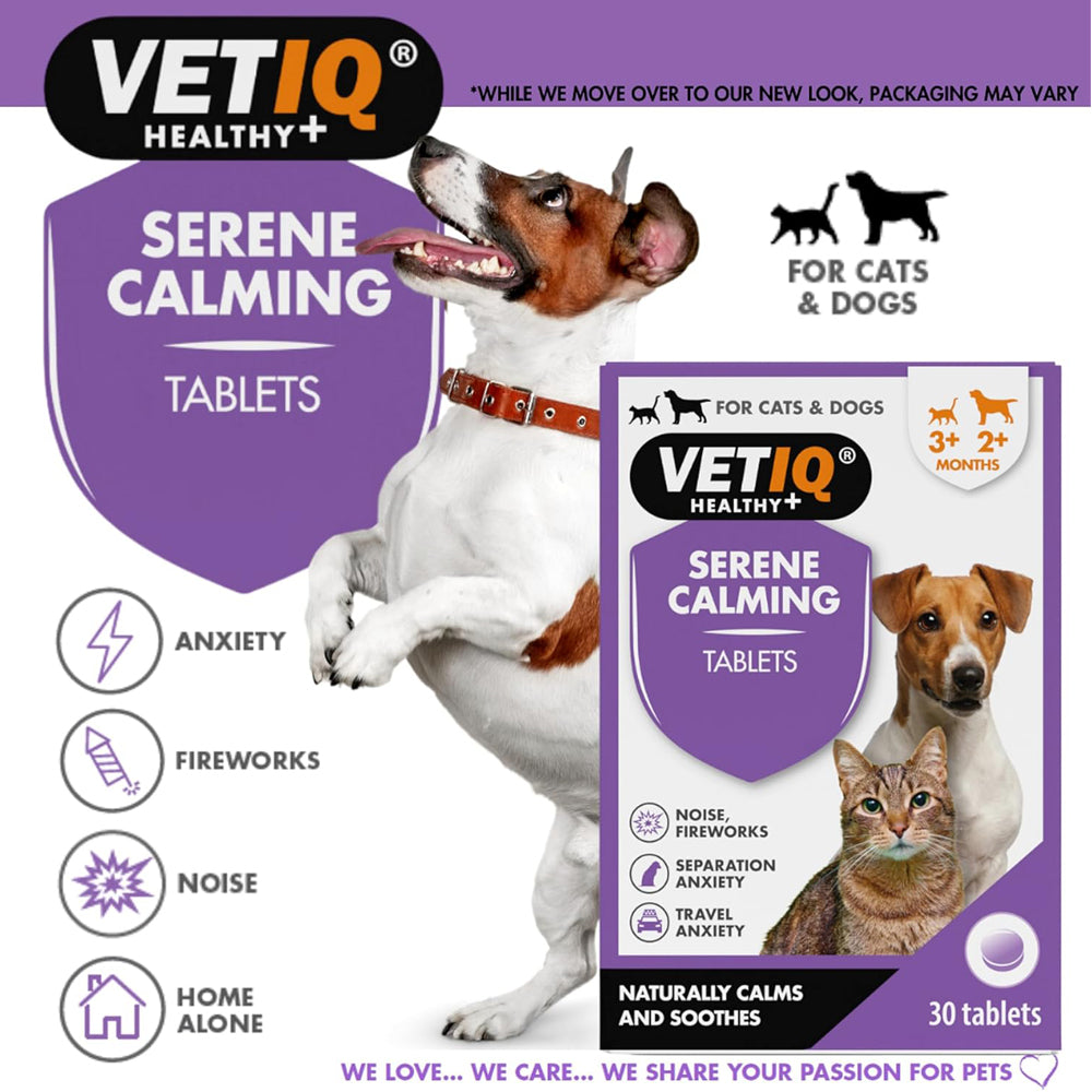 VETIQ Serene Calming Tablets are designed to naturally calm and soothe cats and dogs during times of stress and anxiety. Ideal for situations such as fireworks, loud noises, travel, thunderstorms, or longer-term issues like separation anxiety, these tablets help your pet feel more relaxed without causing sedation.