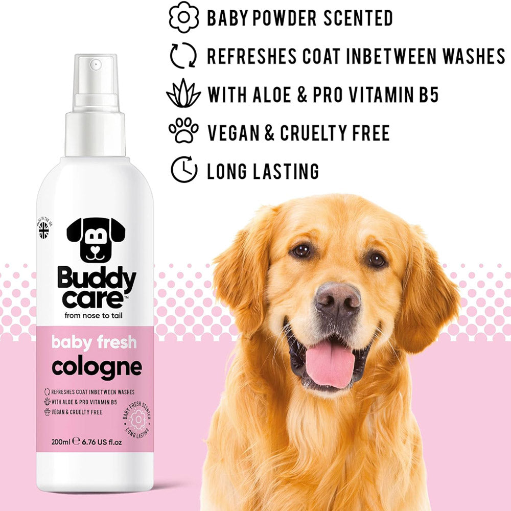 Perfect for in-between bath days, Buddycare Baby Fresh Dog Cologne is the simple way to keep your dog’s coat smelling fresh while also caring for their skin and coat health.
